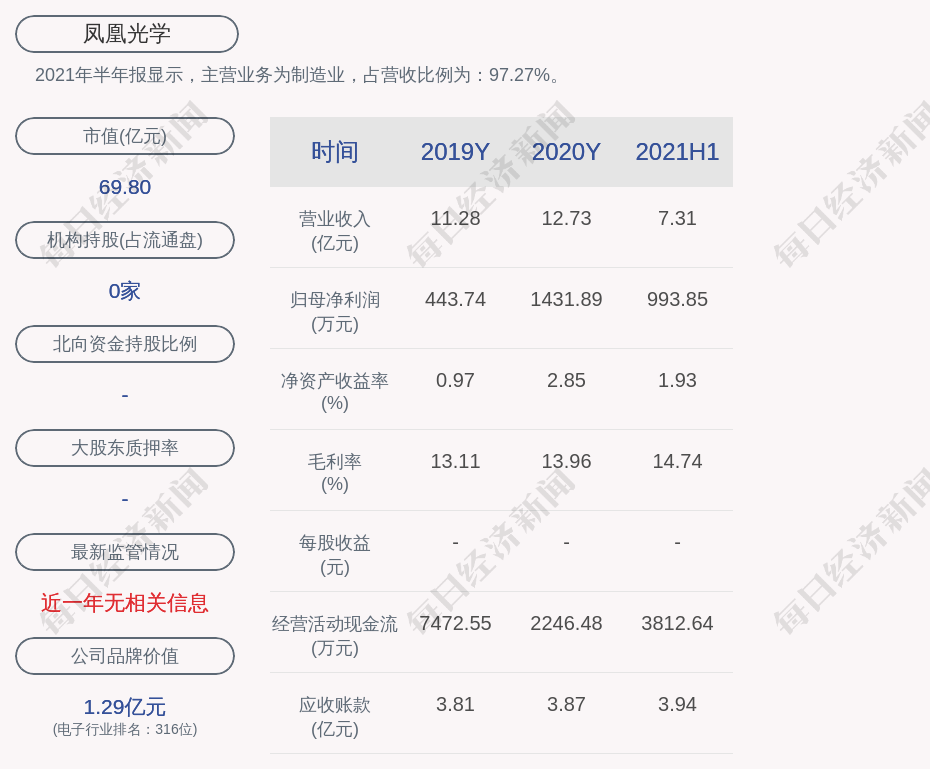 2021年半年报显示,凤凰光学的主营业务为制造业,占营收比例为:97.27%。