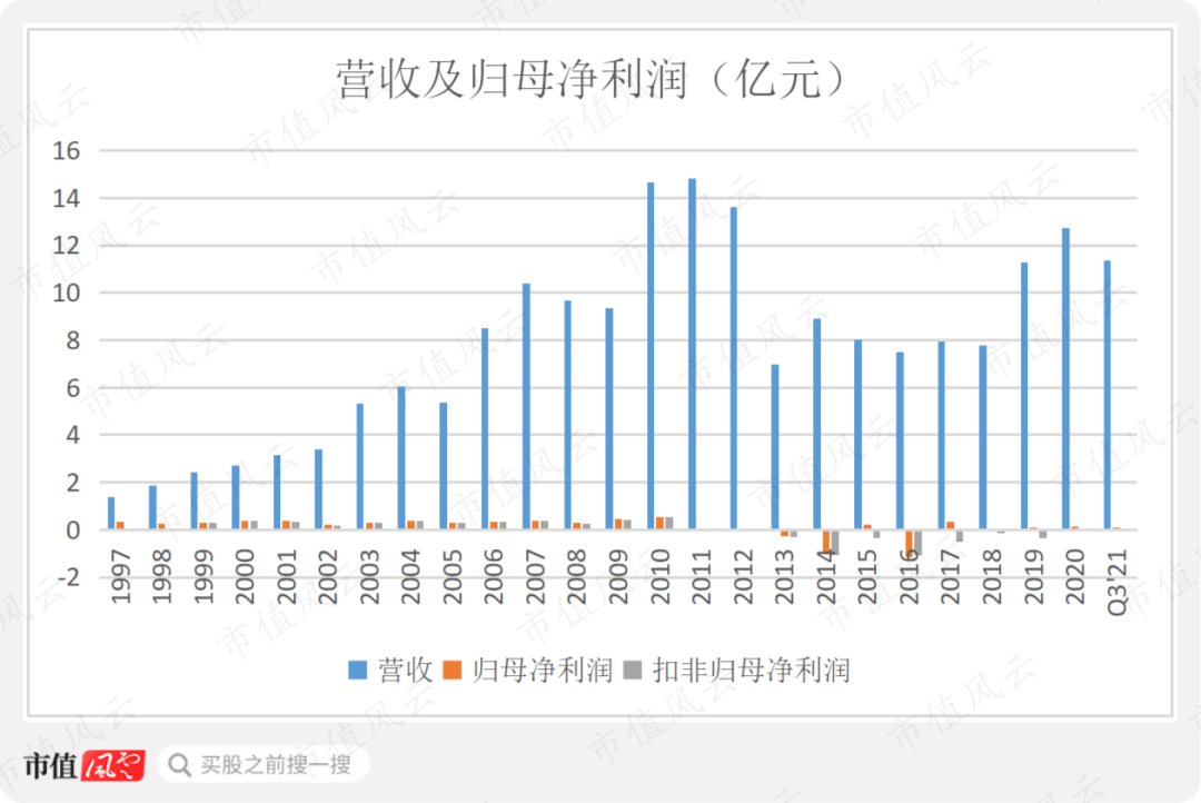 上市以来,公司的业绩一直没有起色,1997-2012年,营收不断增长,从1.4亿增长至13.6亿,但净利润却非常稳定,一直在1亿以下。