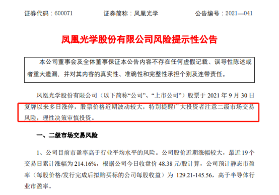 针对二级市场的连续炒作,凤凰光学11月2日发布第一份风险提示公告,指出公司股价近期涨幅较大,公司预计静态市盈率(每股价格/发行完成后拟购买标的公司每股收益)为129.21-145.56,高于半导体行业市盈率,公告中罗列了五大风险因素,提醒投资者二级市场风险。