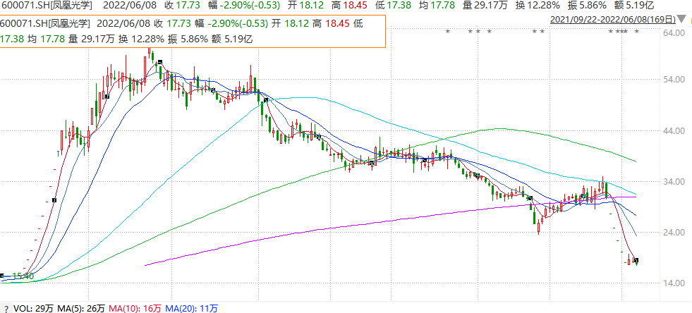 5月28日,凤凰光学(600071.SH)发布了关于终止重大资产重组的公告,随后公司股价连续5个跌停,截至6月8日收盘公司股价为17.73元,较去年最高价已跌超70%,包括社保基金在内的众多投资者被严重套牢。