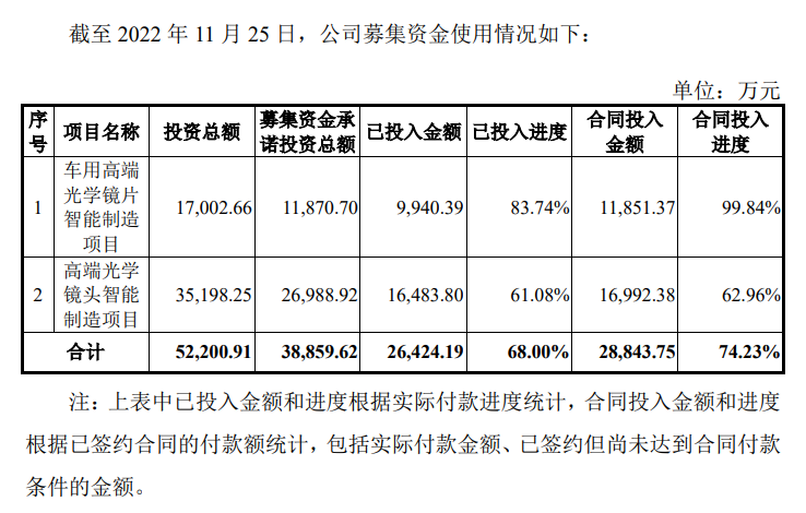 公告称,两个募投项目厂房建设均已完成并投入使用,其中,车用高端光学镜片智能制造项目,镜片产线投资基本完成;高端光学镜头智能制造项目鉴于市场客户需求变化,部分产能扩张相关的生产设备未做投入,但产品主体工艺生产链已基本构建完成。