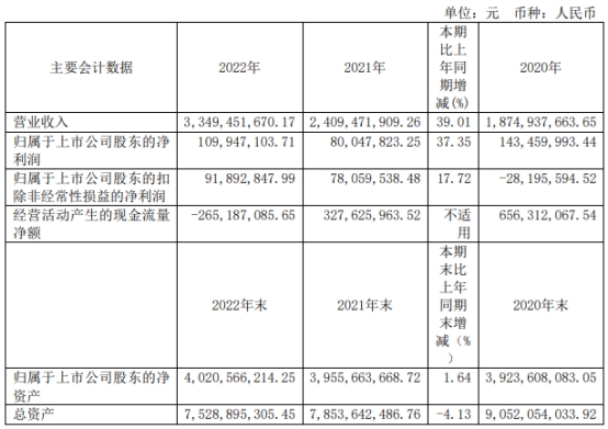 中船科技2022年营业收入为33.49亿元,同比增长39.01%;归属于上市公司股东的净利润为1.10亿元,同比增长37.35%;归属于上市公司股东的扣除非经常性损益的净利润为9189.28万元,同比增长17.72%;经营活动产生的现金流量净额为-2.65亿元,上年同期为3.28亿元。