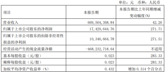 中船科技2023年第一季度营业收入为6.70亿元,同比增长42.26%;归属于上市公司股东的净利润为1742.96万元,同比增长271.71%;归属于上市公司股东的扣除非经常性损益的净利润为1034.67万元,同比增长271.51%;经营活动产生的现金流量净额为-4.68亿元。