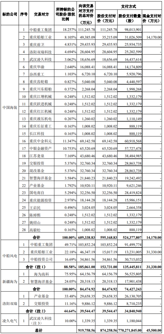 中船科技2023年6月29日发布的发行股份及支付现金购买资产并募集配套资金暨关联交易报告书(草案)(上会稿)显示,中船科技拟通过发行股份及支付现金的方式购买交易对方持有的标的资产,即中国海装100%股份、凌久电气10%少数股权、洛阳双瑞44.64%少数股权、中船风电88.58%股权和新疆海为100%股权。