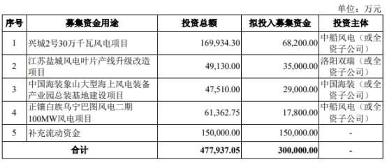 中船科技拟向不超过35名符合条件的特定投资者,以询价的方式发行人民币普通股(A股)募集配套资金,募集配套资金总额拟不超过300,000万元,募集配套资金总额不超过本次交易中发行股份购买资产交易价格的100%。募集配套资金所发行股份数量不超过本次交易中发行股份及支付现金购买资产完成后上市公司总股本的30%。本次募集配套资金在扣除本次交易相关费用后,拟用于兴城2号30万千瓦风电项目、江苏盐城风电叶片产线升级改造项目、中国海装象山大型海上风电装备产业园总装基地建设项目、正镶白族乌宁巴图风电二期100MW风电项目、补充流动资金。