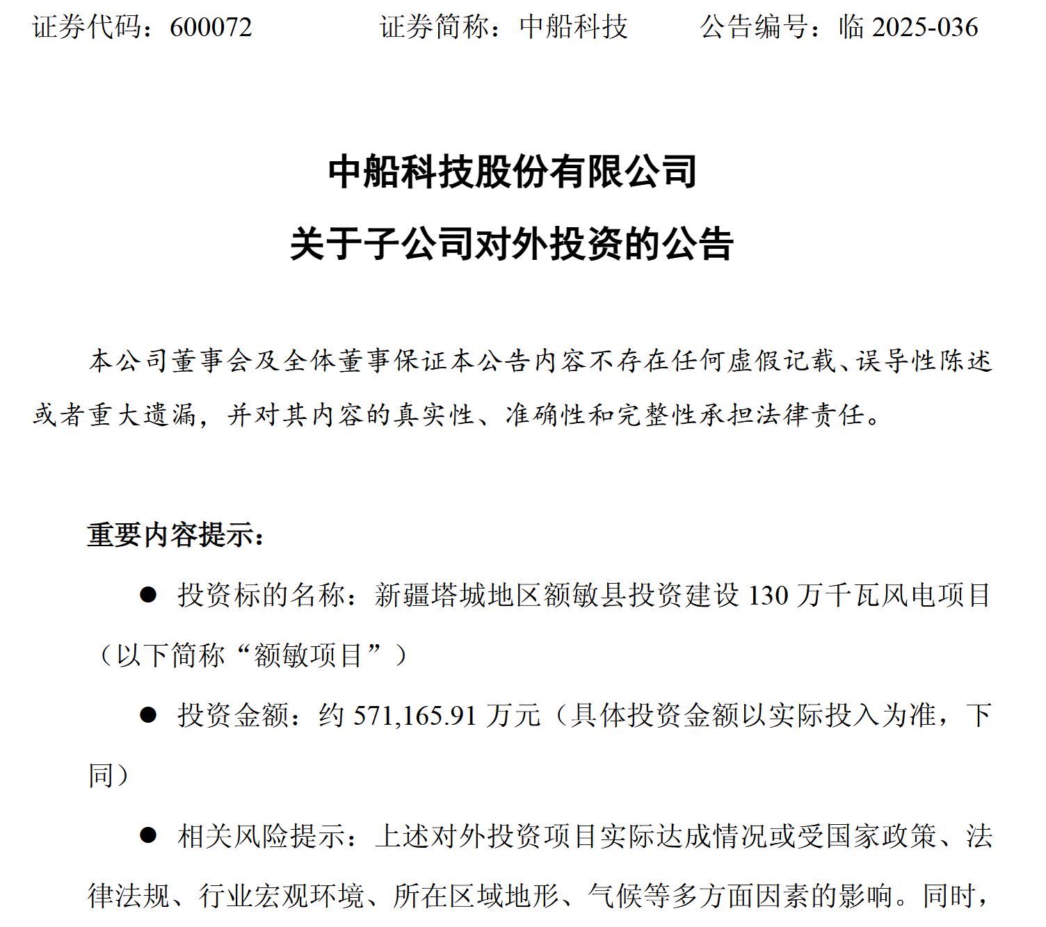 8月6日晚间,中船科技(SH600072,股价13.24元,市值199.5亿元)公告宣布,公司拟通过全资子公司的下属控股子公司在新疆塔城地区额敏县投资建设130万千瓦风电项目(以下简称“额敏项目”),项目总投资金额约为57.12亿元,具体投资金额以实际投入为准。