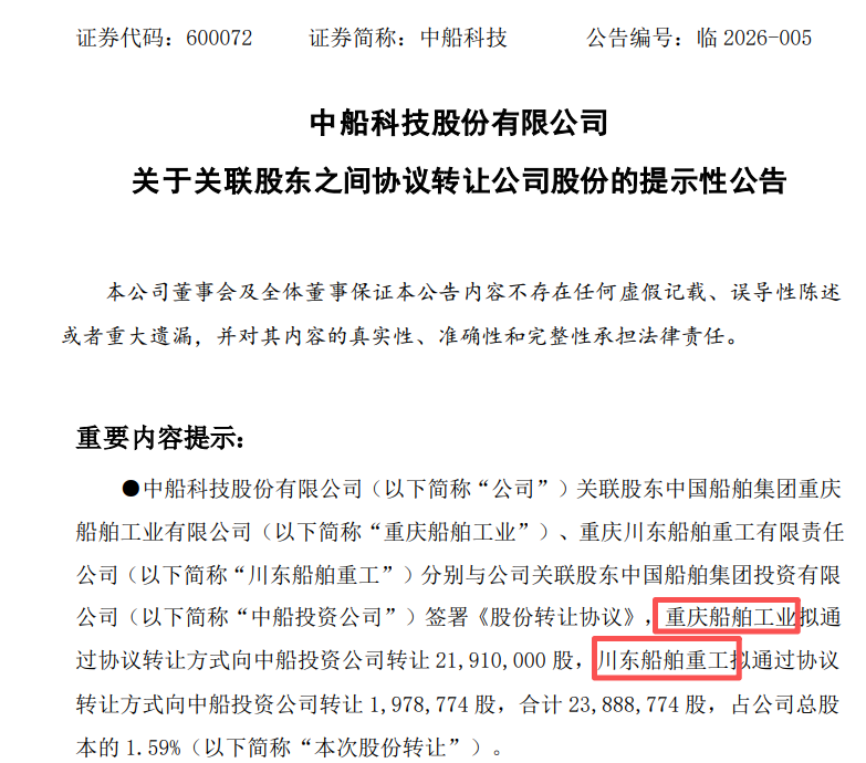 Seaway海事新闻获悉,中船科技股份有限公司(证券代码:600072)于近日完成了一轮关联股东之间的股份协议转让。本次转让系公司控股股东之一致行动人内部的结构调整,不涉及向二级市场减持,也不会导致公司控股股东、实际控制人发生变化。