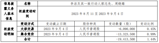 据康欣新材公告,2023年8月11至2023年9月4日,公司股东李洁及其一致行动人郭志先、周晓璐合计减持公司股份1941.35万股,权益变动比例为1.44%。其中通过大宗交易方式减持公司股份609万股,权益变动比例为0.45%;通过集合竞价方式减持公司股份1332.35万股,权益变动比例为0.99%。