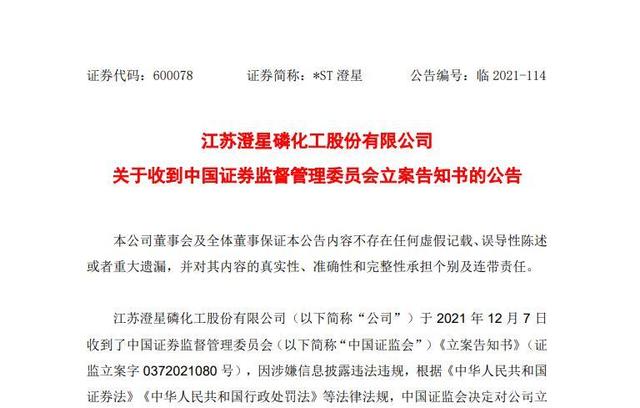 据股民索赔平台股票索赔123网消息,2021年12月7日晚间,*ST澄星发布《关于收到中国证券监督管理委员会立案告知书的公告》。公告显示:江苏澄星磷化工股份有限公司于 2021 年 12 月 7 日收到了中国证券监督管理委员会(以下简称“中国证监会”)《立案告知书》(证监立案字 0372021080 号),因涉嫌信息披露违法违规,根据《中华人民共和国证券法》《中华人民共和国行政处罚法》等法律法规,中国证监会决定对公司立案。同日,公司控股股东江阴澄星实业集团有限公司收到中国证监会《立案告知书》(证监立案字 0372021081 号),因涉嫌信息披露违法违规,根据《中华人民共和国证券法》《中华人民共和国行政处罚法》等法律法规,中国证监会决定对澄星集团立案。