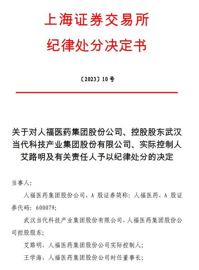 上交所称,鉴于上述违规事实和情节,作出如下纪律处分决定:对人福医药集团股份公司,控股股东武汉当代科技产业集团股份有限公司,实际控制人艾路明,时任董事长王学海,时任董事兼总裁邓霞飞,时任副总裁兼财务总监吴亚君予以公开谴责,并公开认定艾路明3年内不适合担任上市公司董事、监事和高级管理人员;对时任董事长、总裁李杰,时任董事周汉生、张小东、黄峰,时任独立董事王学恭、谢获宝、何其生、刘林青、周睿,时任副总裁兼董事会秘书李前伦予以通报批评。