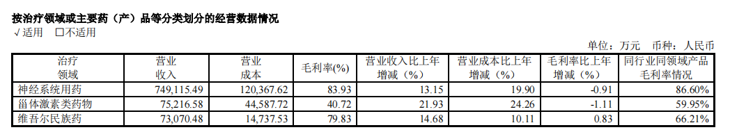 此外,从年报所披露的主要药品经营数据来看,麻醉药品所属的神经系统用药的毛利率也十分可观,高达83.93%。