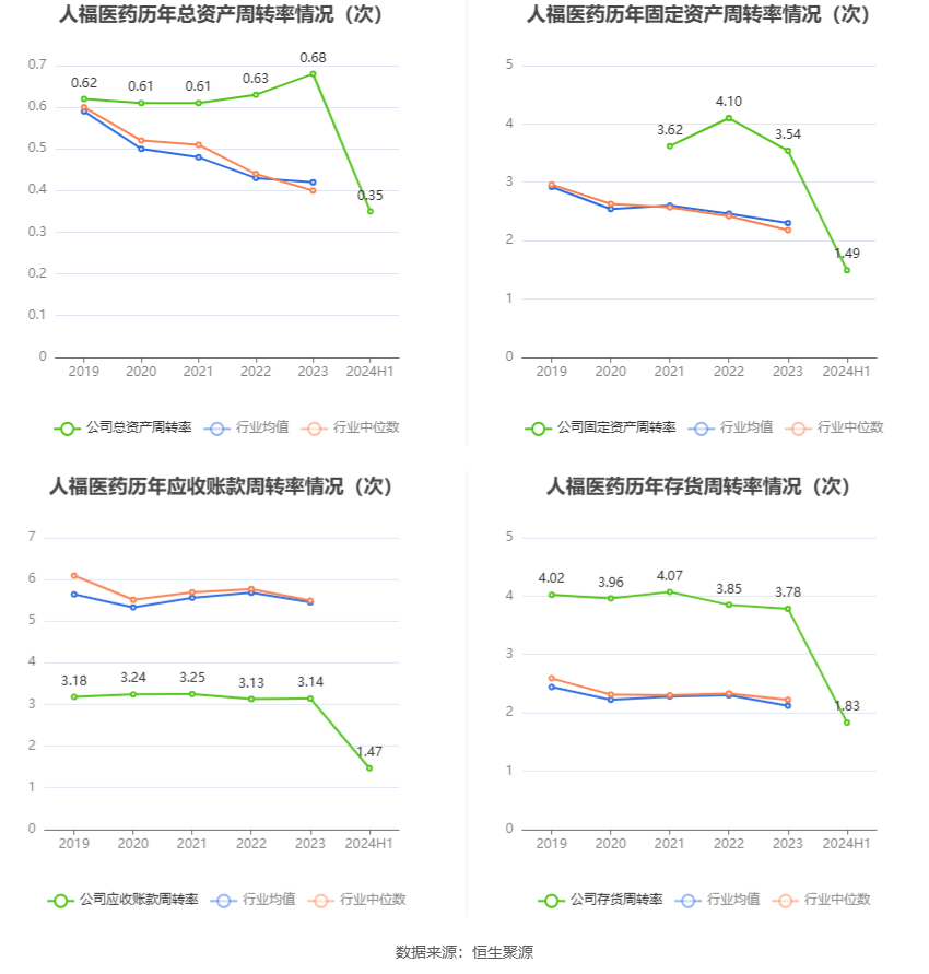 营运能力方面,2024年上半年,公司公司总资产周转率为0.35次,上年同期为0.34次(2023年上半年行业平均值为0.21次,公司位居同行业22/112);固定资产周转率为1.49次,上年同期为2.03次(2023年上半年行业平均值为1.21次,公司位居同行业22/112);公司应收账款周转率、存货周转率分别为1.47次、1.83次。