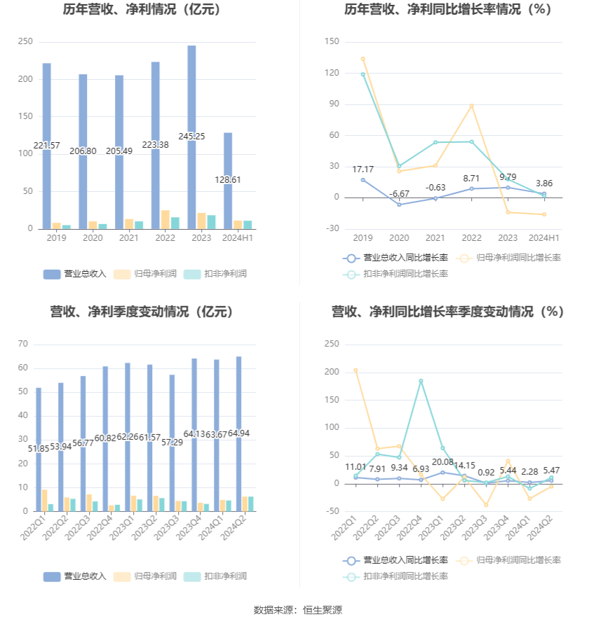 根据半年报,公司第二季度实现营业总收入64.94亿元,同比增长5.47%,环比增长1.99%;归母净利润6.25亿元,同比下降5.13%,环比增长28.44%;扣非净利润6.25亿元,同比增长11.03%,环比增长34.53%。