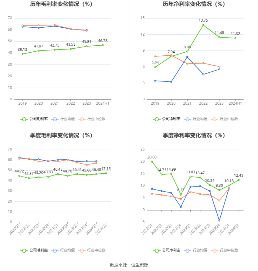 2024年上半年,公司毛利率为46.78%,同比上升1.18个百分点;净利率为11.32%,较上年同期下降2.33个百分点。从单季度指标来看,2024年第二季度公司毛利率为47.15%,同比上升2.39个百分点,环比上升0.75个百分点;净利率为12.43%,较上年同期下降1.04个百分点,较上一季度上升2.25个百分点。