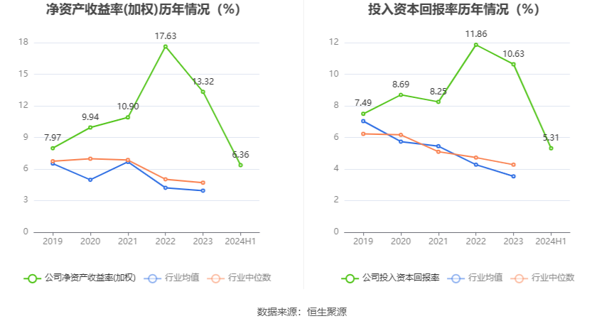 数据显示,2024年上半年公司加权平均净资产收益率为6.36%,较上年同期下降2.04个百分点;公司2024年上半年投入资本回报率为5.31%,较上年同期下降1.06个百分点。