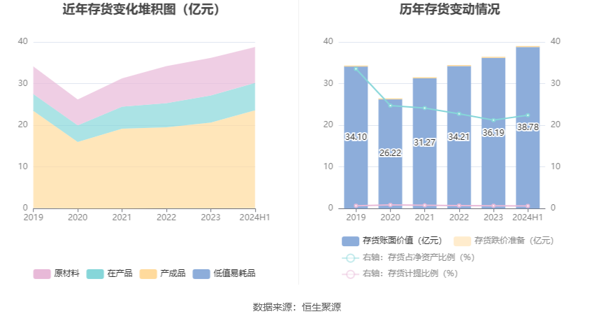 从存货变动来看,截至2024年上半年末,公司存货账面价值为38.78亿元,占净资产的22.43%,较上年末增加2.6亿元。其中,存货跌价准备为2465.81万元,计提比例为0.63%。