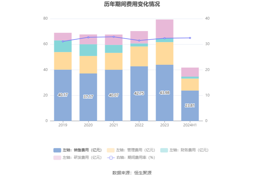 2024年上半年,公司期间费用为41.77亿元,较上年同期增加3.38亿元;期间费用率为32.48%,较上年同期上升1.47个百分点。其中,销售费用同比增长0.81%,管理费用同比增长29.24%,研发费用同比增长10.08%,财务费用同比增长37.59%。