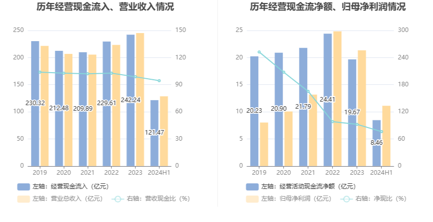 2024年上半年,公司营业收入现金比为94.45%,净现比为76.13%。