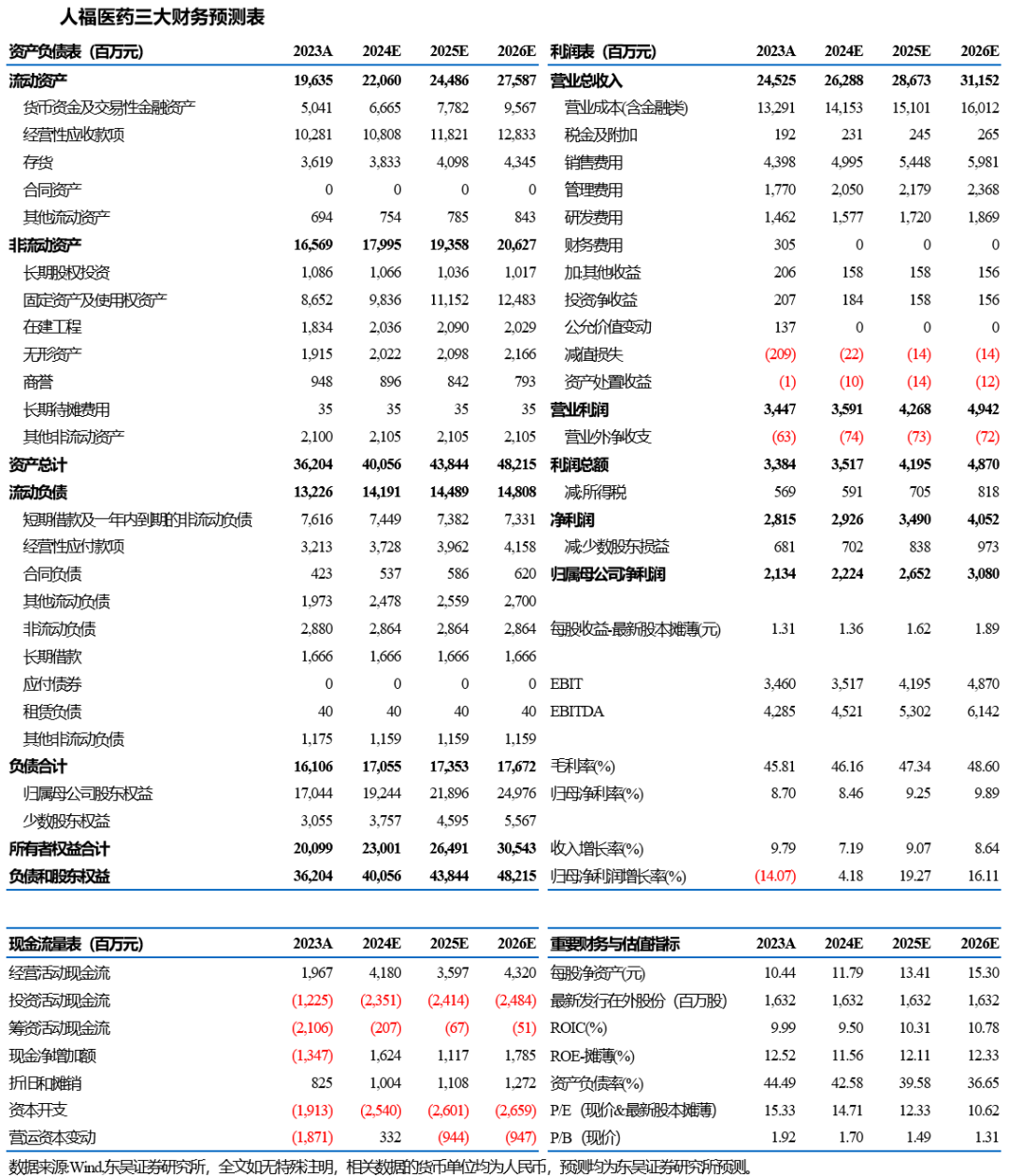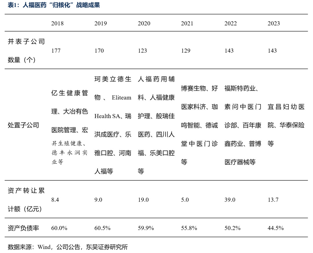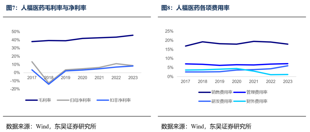 持续推进归核聚焦,各项财务指标显著改善。公司2018年开始实施“归核化”战略,清理出售非核心医药工商业资产、医疗服务资产、部分金融资产等,不断优化公司业务与资产结构。人福医药并表子公司数量由2018年的177家下降至2023年的143家,资产转让累计额超过94亿元,公司资产负债率也从60.0%下降至44.5%,已回到较为健康的水平。同时公司各项财务指标也持续改善,公司毛利率由2017年的38.1%稳步提升至2023年的45.8%,归母净利率也由3.6%提升至8.7%。公司各项费用率保持平稳,其中研发费用率由于公司加大创新药/仿制药及麻药研发有所提升。