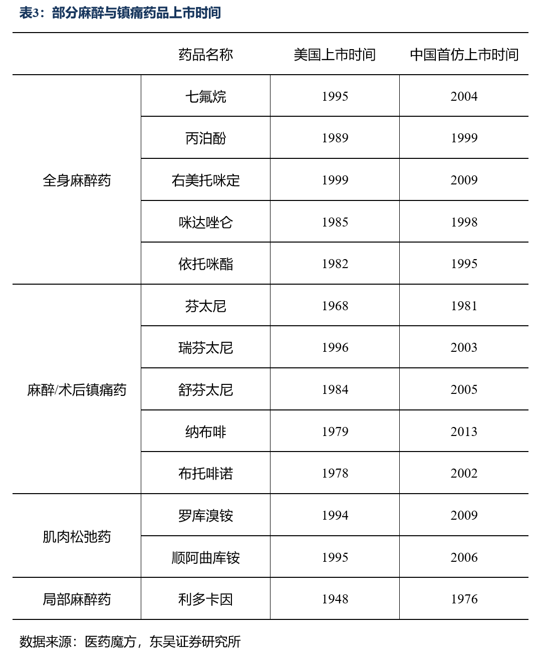 麻醉药相比其他药品具备更长的生命周期与进入壁垒。目前国内乃至全球主流临床精麻药都是老药,例如丙泊酚、芬太尼等1990s之前就已获批上市,新药迭代速度极慢,主要原因为:①政策监管严格;②精麻药作用机制复杂,新药需要长时间验证;③精麻药进院较一般药品更复杂,新药推广需要更多资源,且医生尝试新药品意愿低。