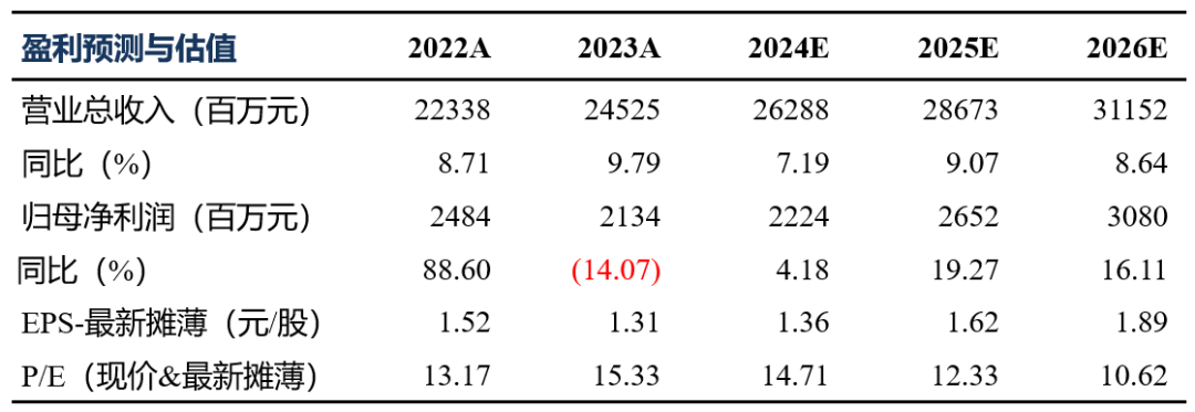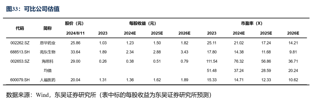 我们预计人福医药2024-2026年营收分别为262.9/286.7/311.5亿元,归母净利润分别为22.24/26.52/30.80亿元。以归母口径计算当前市值对应2024-2026年PE分别为15×/12×/11×。我们选取与公司同处麻醉行业或业务有相似性的公司作为可比公司,与可比公司相比人福医药市盈率较低,我们认为公司作为高壁垒麻醉药行业的龙头,当前位置被低估,随着公司其他麻醉药与镇静药逐步放量以及多科室拓展,业绩有望持续兑现,估值有修复空间,首次覆盖,给予“买入”评级。
