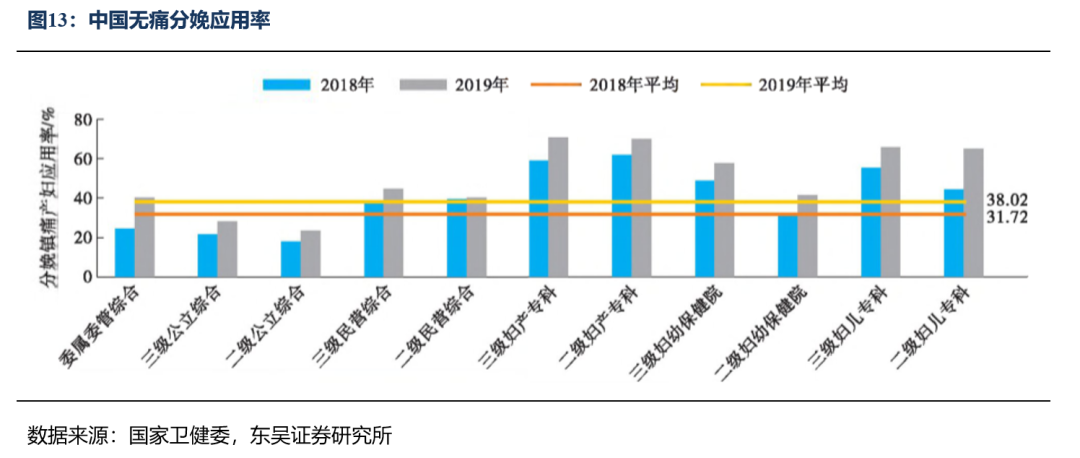 随着经济与医疗水平的发展,国民逐步追求更舒适的医疗体验,对疼痛忍受阈值降低,随之释放非手术麻醉镇痛需求。手术室外麻醉主要包括放射学检查麻醉、内镜检查麻醉、心导管检查和治疗、无痛分娩与无痛人流等领域,与发达国家应用渗透率相比,中国各场景下均有较大提升空间。以无痛分娩为例,受经济负担、生育观念、了解程度不够等影响,中国无痛分娩整体普及率较低。2018年11月国家卫健委发布《关于开展分娩镇痛试点工作的通知》,明确提出要提升分娩镇痛的覆盖范围,普及镇痛条件下的自然分娩,降低剖宫产率,增强医疗服务舒适化程度。根据国家卫健委麻醉专业质控中心工作报告,2018年中国无痛分娩普及率约为31.7%,2019年提升至38%,离欧美发达国家80%-90%仍有较大提升空间。此外,肠镜、胃镜等渗透率也处于较低水平,整体来看手术室外麻醉占比在2019年仍不超过40%,持续助力麻醉药应用场景拓展,带来增量空间。