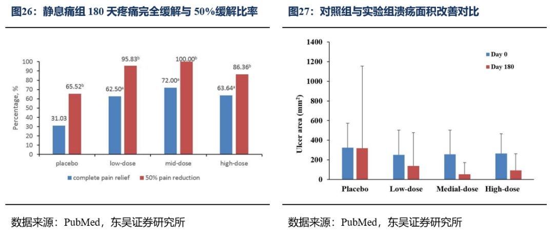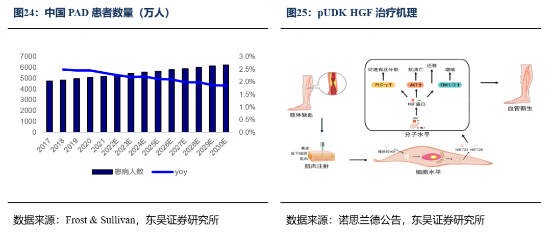 PAD市场需求大,现行疗法治疗效果有限。在外周动脉疾病(PAD)中,下肢缺血性疾病在临床上最为常见,是由各种原因导致的下肢动脉狭窄或闭塞、血流灌注不足,从而导致下肢间歇性跛行、疼痛、溃疡或坏疽等缺血表现的一类疾病、根据Frost Sullivan数据,2021年中国PAD患者已达5187万人,在老龄化进程下,未来患病人数将持续增加。严重下肢缺血性疾病(CLI)为PAD进展至最严重的缺血阶段,临床症状主要以腿部和脚部静息痛、溃疡及坏疽为主,随着病情进展严重者需要进行截肢。约10%的PAD患者可发展为CLI,目前国内尚无CLI有效治愈药物,故而采用部分抗血小板、前列腺素类及止痛药缓解或腔内血运重建或外科手术治疗。在CLI患者首次接受治疗中,约50%为外科血管重建,25%为单纯药物保守治疗,25%为直接截肢。而接受现有治疗1年后的愈后情况不理想,治愈患者比例仅为25%,CLI持续进展比例为20%,截肢比例为30%,死亡比例为25%。