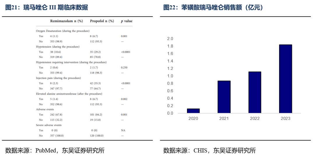 苯磺酸瑞马唑仑安全性优于丙泊酚,适应症持续拓展。注射用苯磺酸瑞马唑仑是宜昌人福联合德国PAION公司共同开发的新型苯二氮?类药物,为超短效GABAa受体激动剂,2020年7月获批上市。根据瑞马唑仑结肠镜诊疗III期数据,镇静成功率非劣效于丙泊酚组(98.9% vs. 99.2%),但安全性优于丙泊酚(AE 67.8% vs. 84.2%,p=0.001),尤其注射痛发生率显著降低(2.3% vs. 35.3%,p<0.0001),有望逐步替代丙泊酚部分市场。同时公司持续拓展苯磺酸瑞马唑仑适应症,2020年7月获批结肠镜检查适应症;2022年3月获批全身麻醉诱导与维持适应症,应用领域由腔镜科室拓展至手术科室;2022年7月获批支气管诊疗镇静适应症;同时用于重症监护(ICU)期间镇静适应症正处于III期临床中。我们认为随着中国腔镜渗透率的提升以及公司苯磺酸瑞马唑仑适应症的持续拓展,有望保持高速增长。