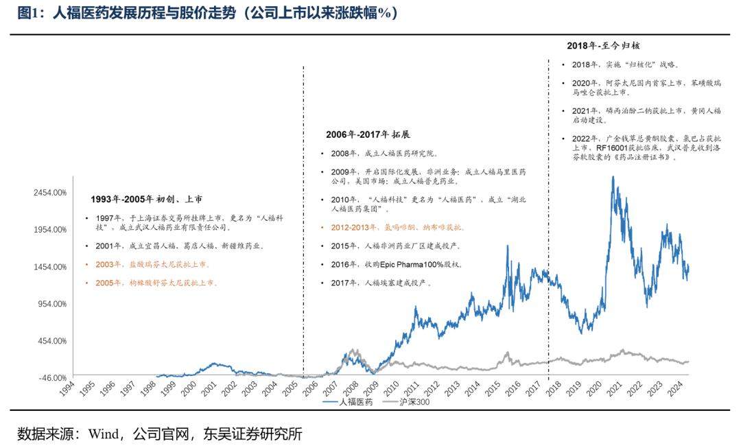 三十年老牌药企,多领域领导者。人福医药集团股份公司成立于1993年,于1997年在上海证券交易所上市,是湖北省医药工业龙头企业、中国医药工业30强、国家技术创新示范企业、中国医药企业制剂国际化先导企业,已在国内的麻醉药品、甾体激素类药物、维吾尔民族药等多个细分领域建立了领导或领先地位。公司先后经历初创、上市、拓展、归核四个阶段,宜昌人福、葛店人福、新疆维药等核心子公司于2001年先后成立;2006-2017年拓展阶段公司明确医药主业,开启国际化发展,开拓非洲、美国市场,收购美国仿制药公司Epic Pharma100%股权;2018年公司开始实施“归核化”战略,清理出售非核心医药工商业资产、医疗服务资产、部分金融资产等,不断优化公司业务与资产结构。同时宜昌人福已成为亚洲最大麻醉药品研发生产基地和国内唯一芬太尼全系生产企业。