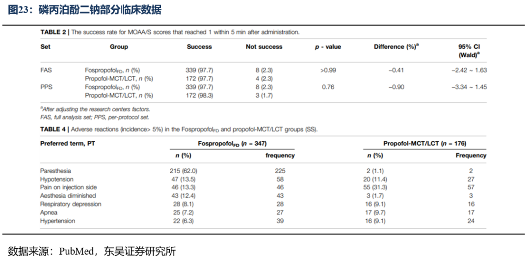 磷丙泊酚二钠处于市场开拓期。丙泊酚是静脉麻醉镇静领域的王牌产品,起效快,苏醒时间短,苏醒后几乎无恶心呕吐等副作用。但现行2种丙泊酚注射液在临床使用中会引起注射部位局部疼痛、高血脂症、增加肝脏负担等问题。根据CHIS数据,2023年丙泊酚乳状注射液与丙泊酚中/长链脂肪乳注射液销售规模接近30亿元。而磷丙泊酚二钠是水溶性丙泊酚前药,不需要市售丙泊酚制剂的脂肪乳载体,不仅可以减轻静脉注射疼痛,避免ICU长期镇静时出现脂代谢的紊乱,还可以减少输注过程中的细菌污染机会。人福医药I类新药注射用磷丙泊酚二钠于2021年5月获批上市,作为静脉用全身麻醉剂用于成人全身麻醉的诱导。根据III期临床数据,在受试者中使用20mg/kg注射用磷丙泊酚二钠进行全麻诱导的镇静效果与使用2mg/kg 丙泊酚中/长链脂肪乳注射液相当,镇静成功率均为97.7%,但磷丙泊酚二钠不良反应发生率低,尤其注射痛发生率显著低于丙泊酚。公司注射用磷丙泊酚二钠正处于市场开拓阶段。