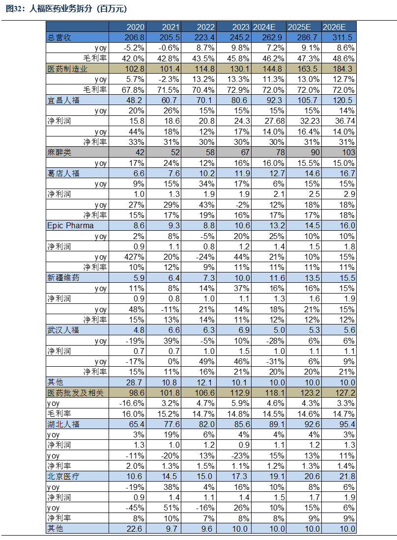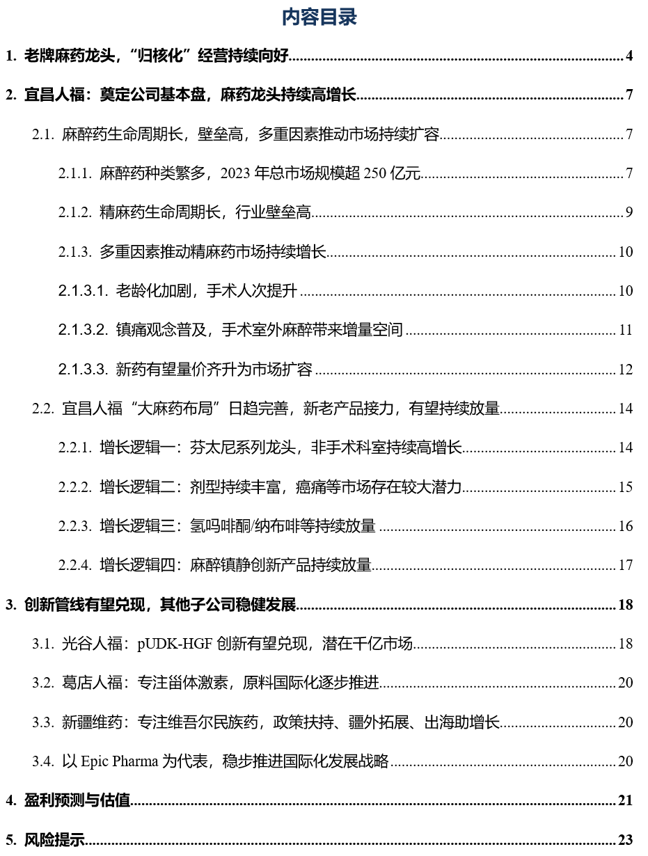 宜昌人福:奠定公司基本盘,麻药龙头高增长:宜昌人福为公司核心子公司,2023年贡献33%的收入与91%的归母净利润,宜昌人福增长逻辑主要体现在:①芬太尼系列龙头,2023年市占率超过90%,同时非手术科室持续高增长,2017-2023年CAGR达41%,随着适应症增加与科室开拓,未来随行业稳健增长;②中国市场麻药渗透率与剂型丰富度均有较大提升空间,公司持续加码口服剂型研发与疼痛管理等应用场景拓展,带来新增量;③氢吗啡酮与纳布啡市场规模正处于快速增长阶段,竞争格局好,同时公司持续推动氢吗啡酮在疼痛肿瘤科室的学术推广和普及,仍有较大的市场开发空间;④公司新药苯磺酸瑞马唑仑与磷丙泊酚二钠安全性均优于丙泊酚,同时瑞马唑仑ICU镇静适应症处于III期临床中,新品增加,持续完善“大麻药”布局。