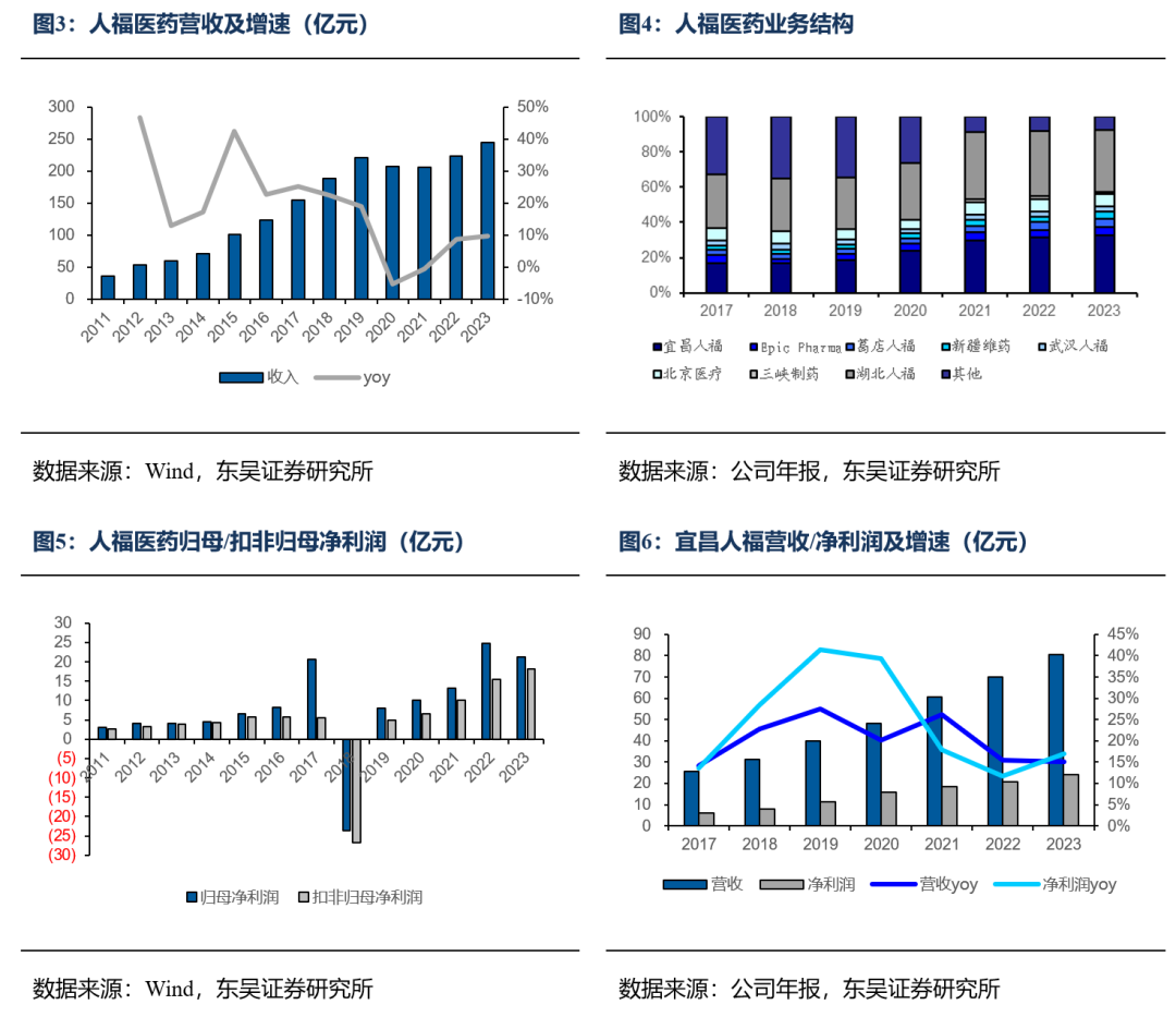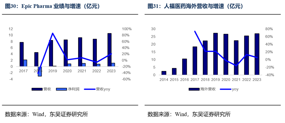 Epic Pharma(2023年全资子公司持有其 100%股权)是一家集研发、生产、销售为一体的美国仿制药企业,具备管制类药品生产资质(美国 DEA 认证)。该公司目前生产经营 200 多个品规的化学仿制药,主要产品有熊去氧胆酸胶囊、氯化钾口服粉末剂、阿奇霉素干混悬剂、盐酸羟考酮速释片、舒林酸片、盐酸氯苯甲嗪、盐酸尼卡地平等。近年来美国仿制药市场产品价格波动较大,因而业绩有所波动,2023年营收10.58亿元,同比增长20%,归母净利润1.15亿元,同比增长44%。除Epic Pharma外,公司多个子公司均在稳步推进国际化:人福非洲、人福马里、人福埃塞等子公司加强资源整合联动,充分发挥本土化生产优势,2023年在非洲市场实现销售收入约 2.73 亿元(+36%);宜昌人福的盐酸安非他酮缓释片(SR 型)(新增适应症)、加巴喷丁片获得美国 ANDA 文号、注射用盐酸瑞芬太尼在印度获批上市;武汉普克的恩扎卢胺软胶囊、二十碳五烯酸乙酯软胶囊获得美国 ANDA 文号;葛店人福、新疆维药加快推进在欧洲的产品注册工作。随着出海品类的持续丰富,我们看好公司海外发展的潜力。