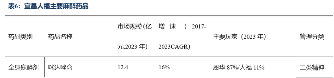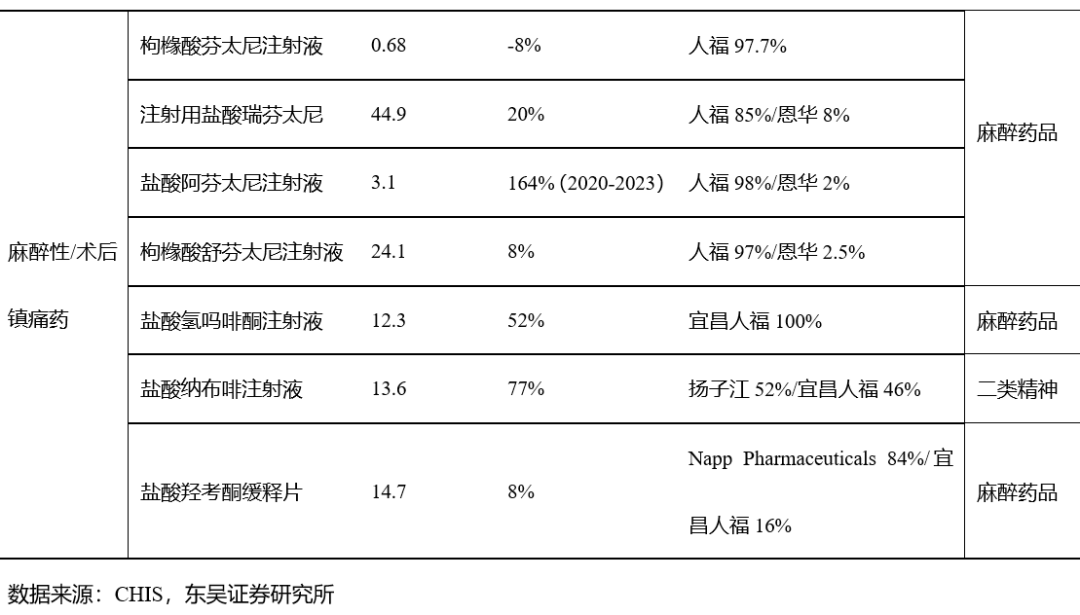 纳布啡是一种新型半合成阿片受体镇痛药,用于缓解中至重度的疼痛。用于术前、术后镇痛和产科镇痛,也可作为复合麻醉时的辅助用药。由于纳布啡安全性高,成瘾性低,因而为白处方品种,更多医生具备权限,应用场景广,因而具备更大的市场空间,根据CHIS数据,2023年纳布啡国内销售额13.63亿元,同比增长54%,2017-2023年CAGR达77%,是增速最快的白处方品种之一。人福医药盐酸纳布啡注射液2013年首仿上市,2017年进入医保乙类目录,2023年市占率约为46%。纳布啡竞争格局较好,目前仅有4家企业通过一致性评价,尚无第五家申报,短期也无集采风险,有望进一步放量。