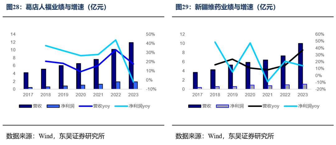 新疆维药(2023年公司持有73.25%股权)致力于中药民族药的种植、生产、研发与销售,是国家高新技术企业。该公司目前拥有20个国药准字号产品,其中有12个全国独家品种,4个国家中药保护品种;12个品种被列入国家医保目录,全部20个品种均列入新疆维吾尔自治区地方医保目录。该公司主要产品有复方木尼孜其颗粒、祖卡木颗粒、寒喘祖帕颗粒、石榴补血糖浆、养心达瓦依米西克蜜膏、通滞苏润江胶囊、护肝布祖热颗粒等。2023年新疆维药市场覆盖率大幅提升,疆内疆外市场同时发力,营收10.03亿元,同比增长37.2%,2017-2023年CAGR18.0%;2023年净利润1.13亿元,同比增长14.1%,2017-2023年CAGR19.4%。新疆维药积极布局中亚市场,祖卡木颗粒等 6 个产品已在中亚国家注册销售,同时近年来民族药受到重点扶持,新疆维药将加快推进疆外市场的市场准入和临床应用工作,有望进一步快速发展。