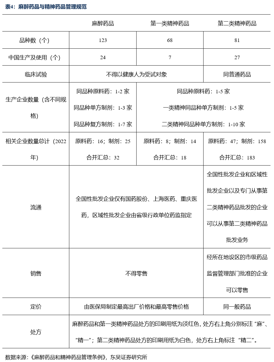 麻醉药由于具有药物成瘾、保命等行业特殊性,成为各国重点监管对象,政府逐步从药品管制范围、生产许可、经营流通等多个维度进行严格全面把控,使得麻醉药品行业进入壁垒较高。中国1950年颁布第一部麻醉药品管理文件—《管理麻醉药品暂行条例》,1987/1988年分别颁布《麻醉药品管理办法》和《精神药品管理办法》,逐渐步入法治正轨。2005年国家出台《麻醉药品和精神药品管理条例》并沿用至今,管理条例对麻醉药品不分类,严格管制,将精神药品分为严格管控的第一类精神药品与管控较弱的第二类药品,各类药品细则可参照国家药监局发布的《麻醉药品品种目录》与《精神药品品种目录》。