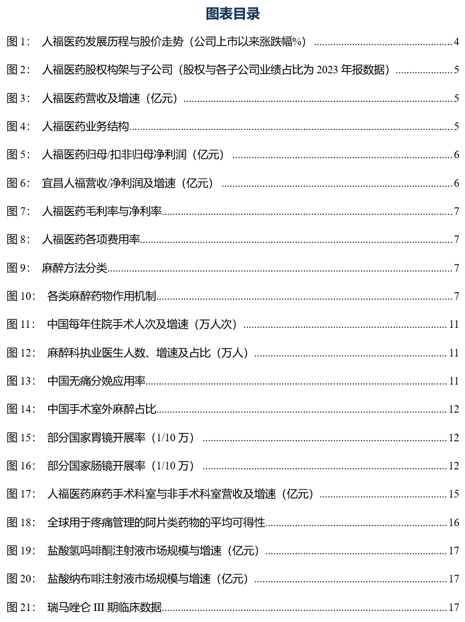 芬太尼系列龙头,市占率高,竞争力强。人福医药瑞芬太尼、舒芬太尼分别于2003/2005年国内首仿上市,阿芬太尼于2020年国内首仿上市,使得宜昌人福成为亚洲最大麻醉药品研发生产基地和国内唯一芬太尼全系生产企业。二十余年深耕公司已成为芬太尼龙头,根据Frost Sullivan数据,麻醉性镇痛药2022年国内市场规模超过149亿元。瑞芬太尼是新型超短时效阿片类镇痛药,镇痛强度与芬太尼相当,主要用于全麻诱导和全麻中维持镇痛,根据CHIS数据,2023年国内市场规模约45亿元,2017-2023年CAGR20%,其中人福医药市占率85%;舒芬太尼是镇痛效应最强的阿片类药物,镇痛强度是芬太尼的5-10倍,消除半衰期短,但镇痛作用持续时间长,使患者循环功能更稳定,更适合于心血管手术和老年病人的麻醉,根据CHIS数据,2023年国内市场规模约24亿元,2017-2023年CAGR8%,其中人福医药市占率97%;阿芬太尼起效与代谢均较快,适用于短小手术/门诊诊疗,2023年国内市场规模约3亿元,处于快速放量期,人福医药市占率98%。芬太尼全系列品种公司均有高市占率且格局较为稳定。