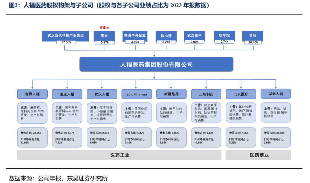 子公司众多,宜昌人福为核心资产。公司控股股东为武汉当代科技产业集团股份有限公司,截至2023年持有公司27.36%股权,武汉当代实控人为艾路明先生(持有武汉当代28.2%股权);公司董事长李杰先生持有公司5.97%股权。人福医药子公司较多,其中主要包括医药工业的宜昌人福、葛店人福、新疆维药、Epic Pharma、武汉人福与医药商业的北京医疗与湖北人福。其中2023年宜昌人福贡献了上市公司总营收的33%与归母净利润的91%。