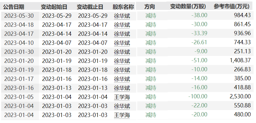 而在2023年,公司股东徐华斌、王学海更是数次减持公司股票。其中,王学海曾是人福医药的前董事长;而徐华斌是公司前副总裁,在2023年时还是公司前十大股东之一。