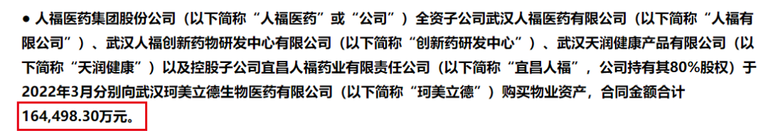 在披露2024年半年度财报的同一时刻,人福医药同步披露了4项关联交易。其中,2022年3月,公司子公司人福有限公司、创新药研发中心、天润健康、宜昌人福向珂美立德购买物业资产,合同金额合计16.45亿元。