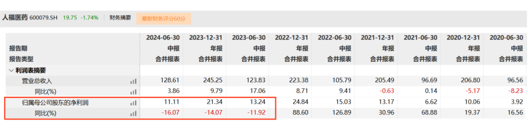 以此来看,2024年上半年是自2020年以来,人福医药的中期、年度归母净利润下滑幅度最高的一年。