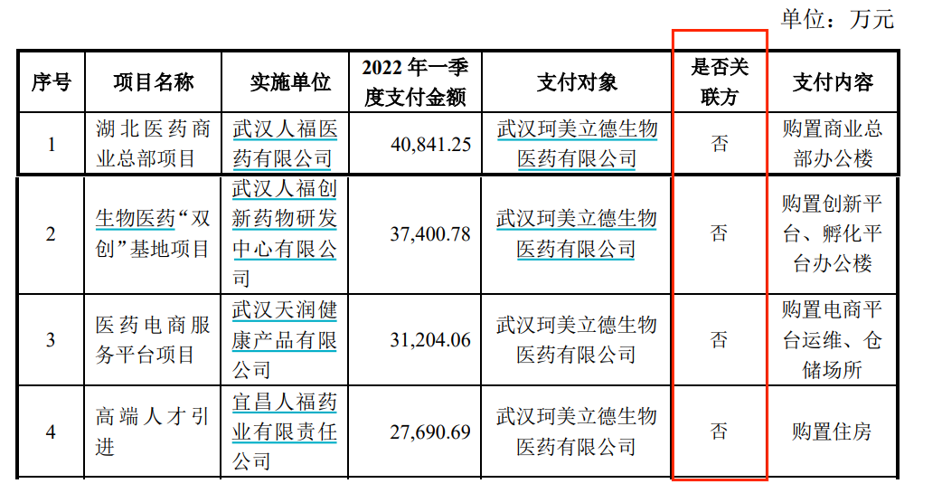 除此之外,子公司武汉普克、医药研究院、黄冈人福曾先后与承包商新洪建筑签署施工合同,其中,两项已完成第三方审定的工程造价合计1.49亿元,另外一项未完成第三方审核的项目合同金额2.90亿元;2022年3月,公司向遥星医药收购葛店药辅40%股权,股权转让款为1亿元。