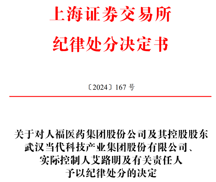 对人福医药集团股份公司控股股东武汉当代科技产业集团股份有限公司,实际控制人艾路明予以公开谴责;对人福医药集团股份公司,时任董事长兼总裁李杰、时任总裁邓霞飞、时任财务总监吴亚君、时任董事会秘书李前伦予以通报批评。