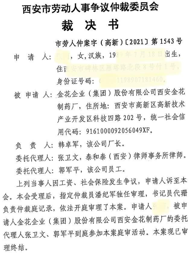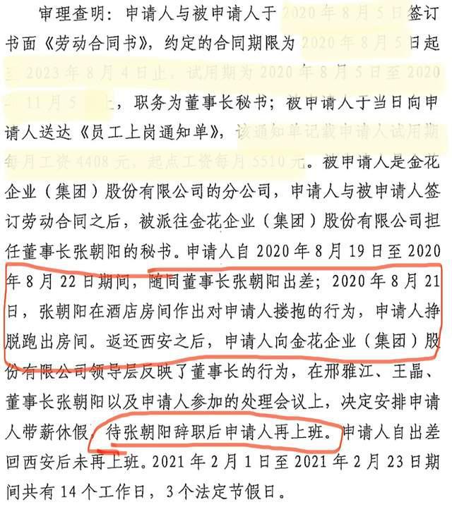 裁决书内容显示,“返回西安后,申请人向金花企业(集团)股份有限公司领导层反映了董事长的行为,在邢雅江、王晶、董事长张朝阳参加的处理会议上,决定安排申请人带薪休假,待张朝阳辞职后再来上班。”