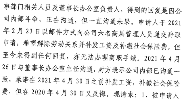 事实上,处理会议之后,张朝阳并未辞职或遭罢免,至今仍牢踞金花股份(600080.SH)董事长之位,反而是女秘书自去年10月起就被金花股份停发工资、断缴社保。今年2月23日,其无奈提出辞职,并通过劳动仲裁途径讨要工资及补交社保,对这些诉请,仲裁基本予以支持。