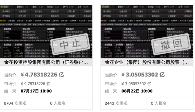 对于这“最后一城”,金花投资显然全力死守。第一次定于7月17日的拍卖,因“案外人对拍卖财产提出确有理由的异议”而中止;二次定于8月22日的拍卖,就在8月10日因“两个案子并案处理”而撤回。