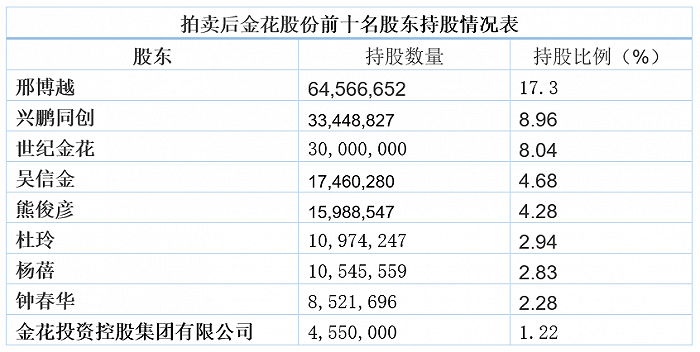 经过2021年年底的股权拍卖后,吴一坚控制下的金花投资在上市公司的持股比例降为1.22%,已失去了实控人资格。持股比例最多的为邢博越(17.3%),其余为江西资本兴鹏同创(8.96%)、世纪金花(8.04%)、吴信金(4.68%)、熊俊彦(4.28%)等机构和自然人。