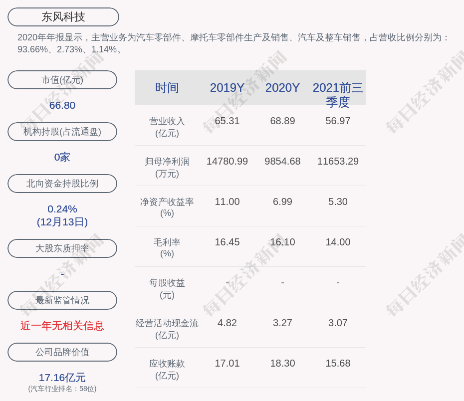 2020年年报显示,东风科技的主营业务为汽车零部件、摩托车零部件生产及销售、汽车及整车销售,占营收比例分别为:93.66%、2.73%、1.14%。