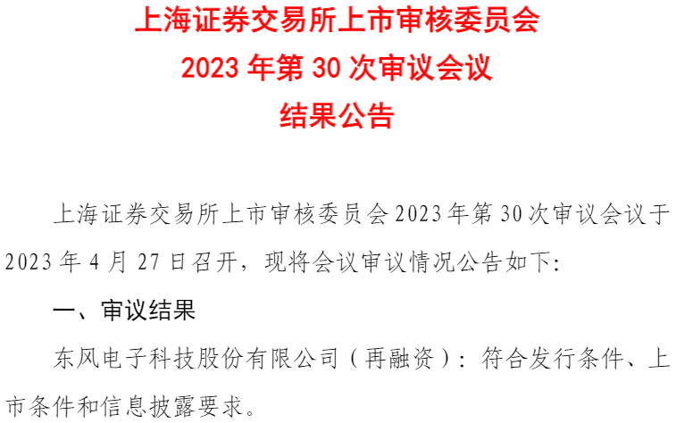 东风科技(600081.SH)昨日晚间发布公告称,上海证券交易所上市审核委员会于昨日召开了2023年第30次审议会议,对公司向不特定对象配股的申请进行了审议。根据会议审议结果,东风科技本次向不特定对象配股的申请符合发行条件、上市条件和信息披露要求。