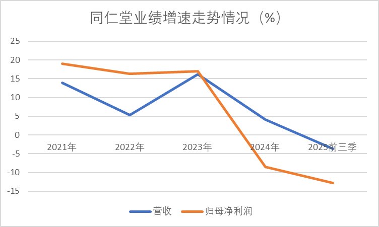 同仁堂 最新的财务表现,同样传递出另一层面的压力信号。2025年三季报显示,公司经营业绩延续了自2024年以来的下滑态势。前三季度实现营业收入133.08亿元,同比下降3.70%;归母净利润为11.78亿元,同比下降12.78%。值得注意的是,公司在2024年已出现“增收不增利”的情况,营收微增但归母净利润同比下滑8.54%,为近五年来首次出现净利润负增长。