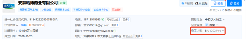 同样值得审视的是产品实际生产方—— 安徽哈博药业有限公司 的资质背景。该公司成立于2008年,由个人全资控股,公开信息显示其参保员工仅8人,其经营范围包含软胶囊剂、中药饮片及保健食品。从经营风险角度看,公开信息显示该公司涉法律诉讼案件达33起,其中涉及3起加工合同纠纷。